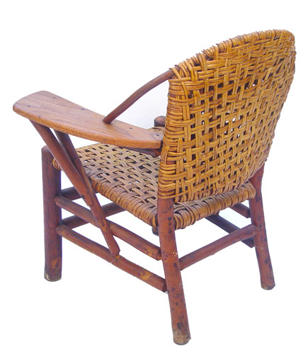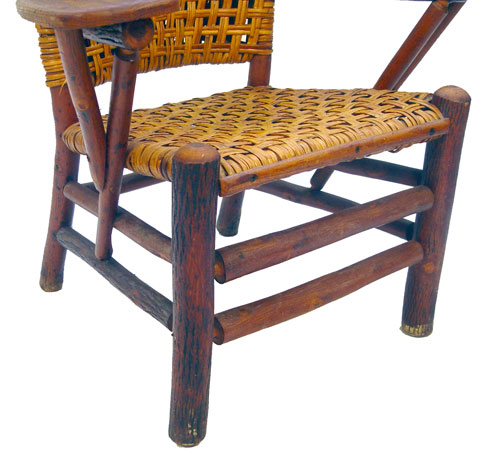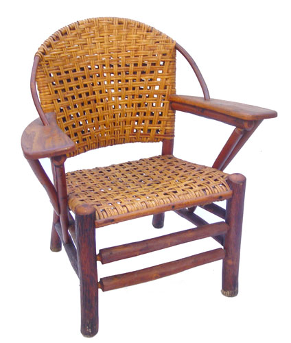 SIGNED OLD HICKORY CHAIR: Woven seat and back, hickory frame. Branded ''Old Hickory Martinsville Indiana''. Alligator finish. 34''h. x 32'' x 20.5''.