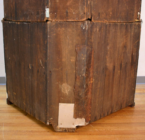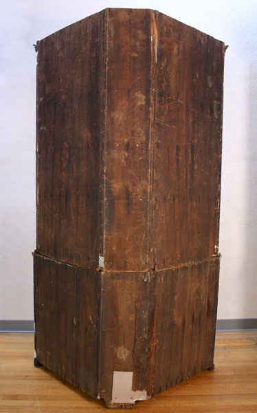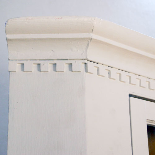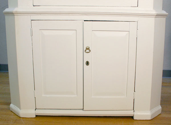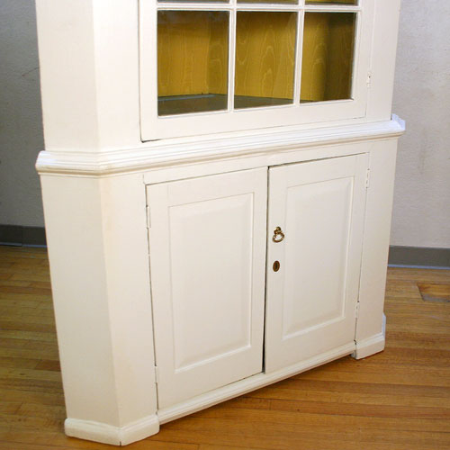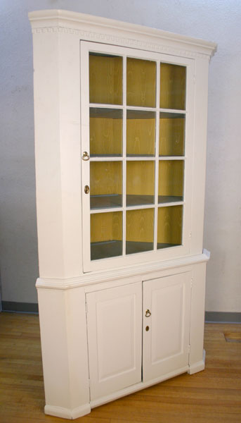 2 PART FEDERAL POPLAR CORNER CUPBOARD: Painted finish. Overhanging molded over Greek Key molding. Upper section with 12 individually glazed panes, painted interior. Lower section with double doors. All pulls and escutcheons are replaced. 80''h. x 46'' across front. Est. $1500/1800**