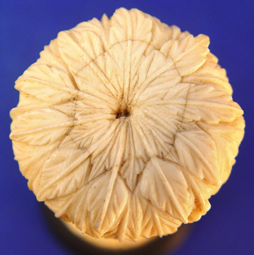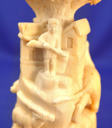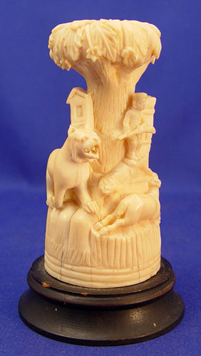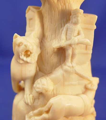 CARVED IVORY FIGURAL GROUP LION AND HUNTER: Animals circling the man and his rifle. The ivory is 4 1/4''h, with wooden base, 5''h.