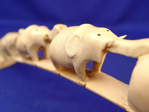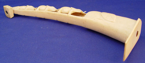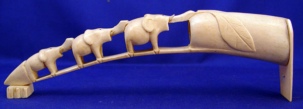 CARVED IVORY ELEPHANT TUSK: Naive carving of three elephants, 11'' long.