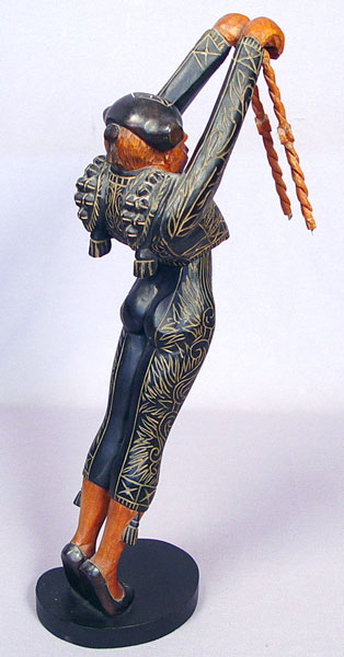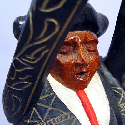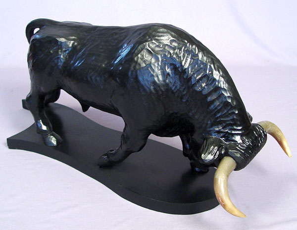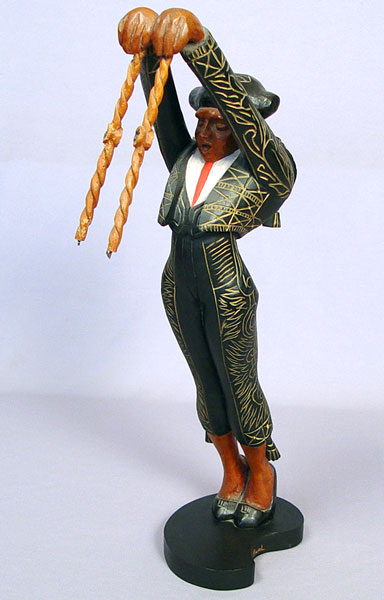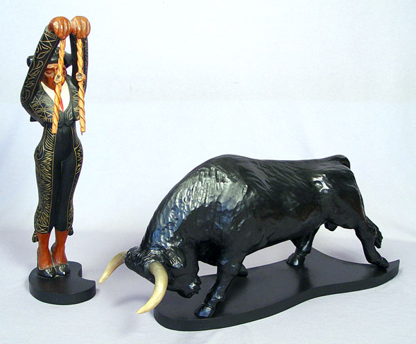 J. PINAL SCULPTURE OF MATADOR AND BULL: Carved wood with black stain finish, marked Made in Mexico, matador 23 3/4''h.