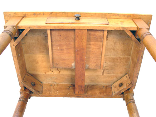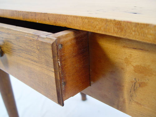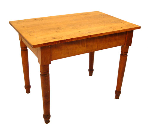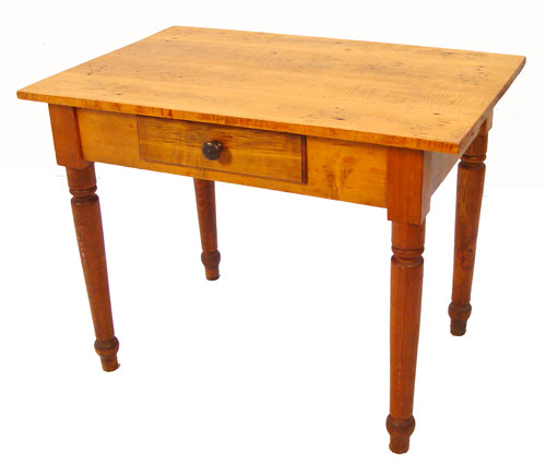 19th C AMERICAN COUNTRY ONE DRAWER WORK TABLE: Suitable as a writing table or desk. Turned legs, single drawer, pine and maple. 27 1/2''h. x 26'' x 23 3/4''.