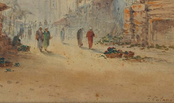 CATANO, Frank, (Italian, 19th C.): Middle Eastern Street Scene, W/C, 18 1/2'' x 12'', signed, framed, 23 1/2'' x 17 1/2''. Several spots of foxing, varnished. Est. $500/800**