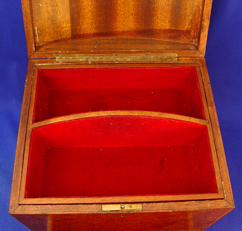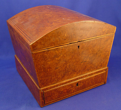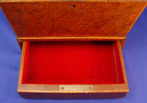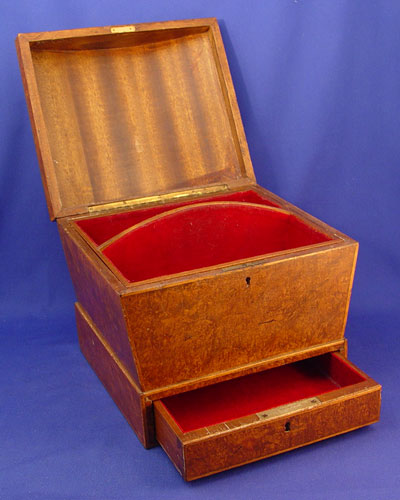 19TH C BURL WOOD BOX: 9''h. x 10 1/4'' x 9'', velvet lined compartment insert, box is not lined. Small drawer is lined. Note there is a lock which is broken.