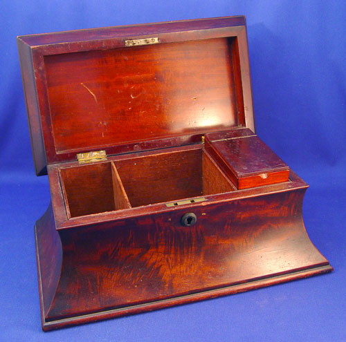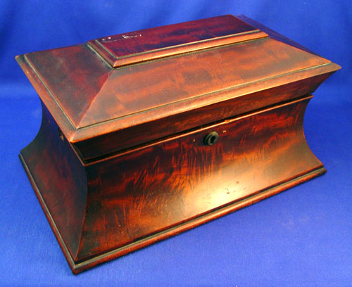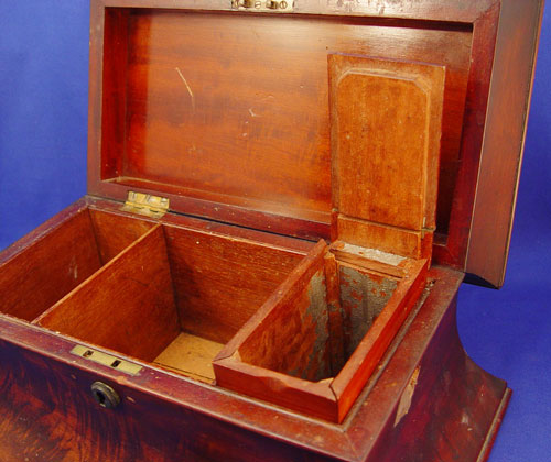 19TH C MAHOGANY BOX: Sarcophagus shape, compartmented interior with one section having a lid. The side knobs are not attached, but in the box. 8''h. x 14'' x 9''.