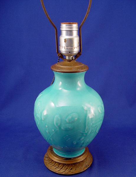 ROOKWOOD POTTERY LAMP: Dated 1940, shape 6053, the pottery is 7 1/2''h., the lamp is 19''h. overall. Raised gazelle design, gloss glaze.