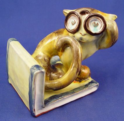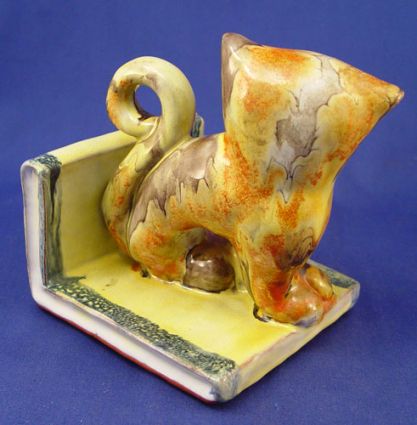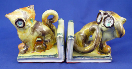 BIMINI ART POTTERY CAT FIGURAL BOOKENDS: Red clay, gloss glaze, ''Bimini'' impression. 5''h.x 4 1/2''.