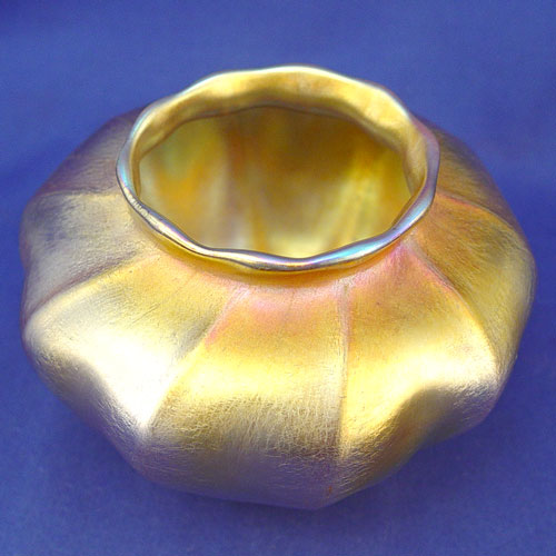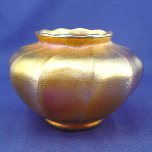 TIFFANY FAVRILE ART GLASS VASE: Ribbed sides. Signed ''1044 7696 K L.C. Tiffany Favrile''. 3 1/2'' h., 5'' dia. overall.