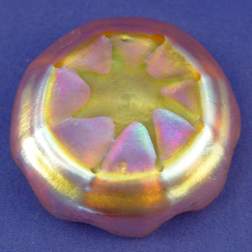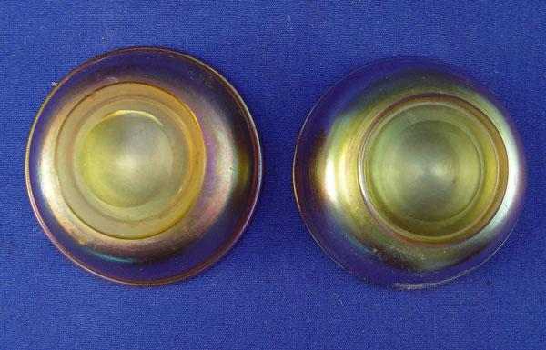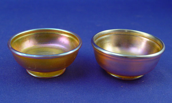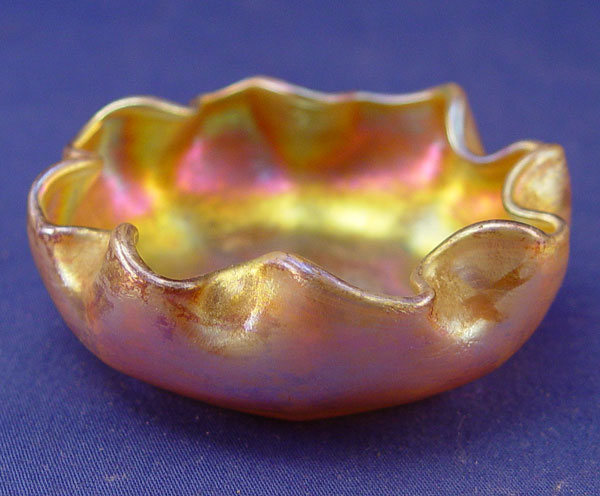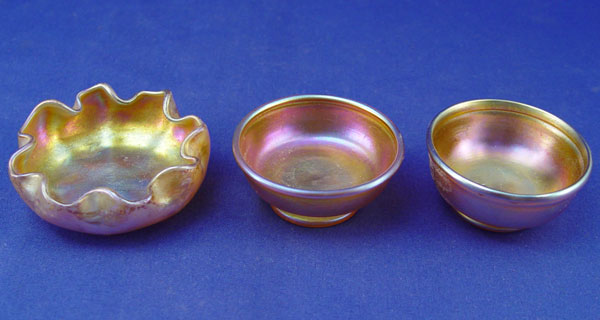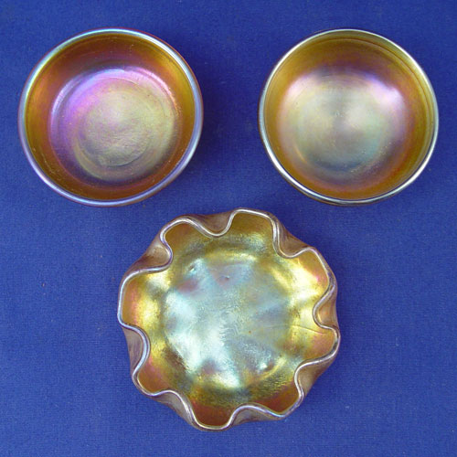 3 TIFFANY FAVRILE ART GLASS NUT DISHES: A matched pair, 2 1/2'' dia., and a ruffle rim dish 3'' dia. Each pieces signed L.C.T.