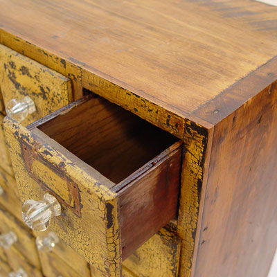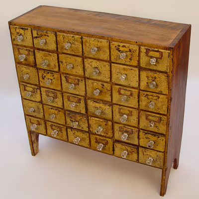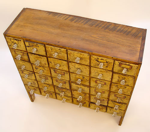 AMERICAN COUNTRY ORIGINAL PAINT 36 DRAWER FILE CABINET: Files, seeds, spices, whatever your fancy. Glass pulls, boot jack feet. 32 1/4'' x 32'' x 10 3/4''.