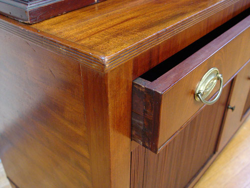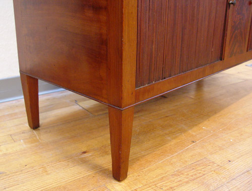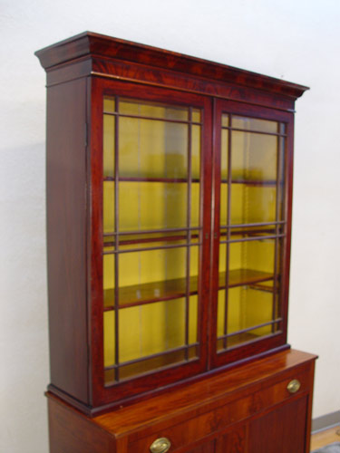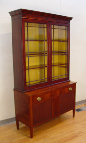 19th c AMERICAN CHINA CABINET TOP on a later base: Painted interior with adjustable shelves, glass front doors, overhanging molding, 50 1/2''h. x 46 3/4'' x 12 3/8''. The base is a mid to later 20th C. cabinet.