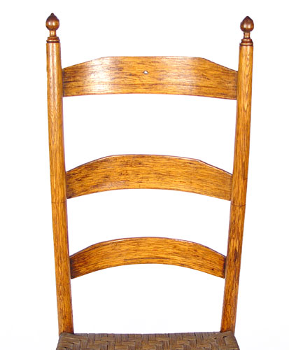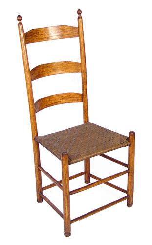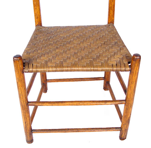 SHAKER attrib. SIDE CHAIR: Turned posts and three slat back with the slats being arched back, one stretcher on back, two on front and sides. Woven splint or reed seat. 38 3/4''h. 16 3/4'' wide. The seat is 15: from the floor.