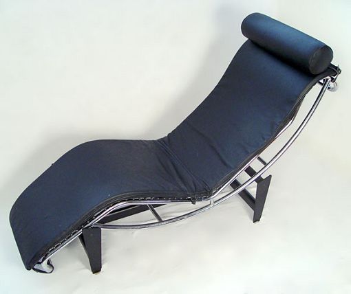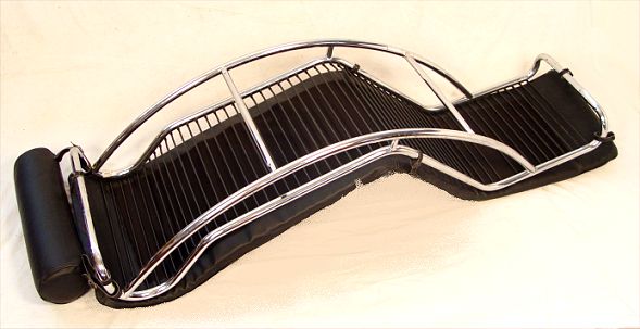 MID CENTURY MODERNE LEATHER CHAISE LOUNGE: Chrome frame with spring supports. To change position chaise, simply slide into place, no mechanics involved. 5' long, 21'' wide.