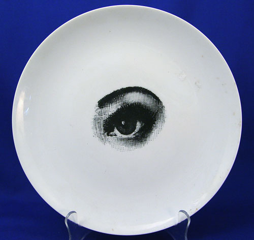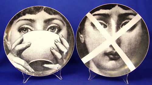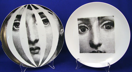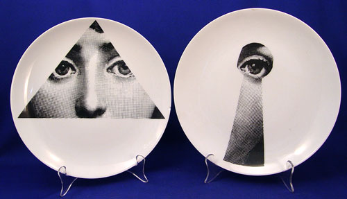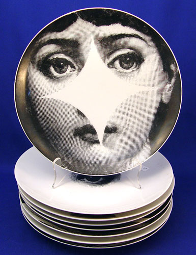 8 FORNASETTI PLATES FROM THE TEMA E VARIAZONI SERIES: Made in Italy, designed by Pablo Fornasetti. 10'' dia. Included are numbers 14, 42, 191, 49, and 35. Three plates are chipped, numbers 30, 55, and 70.