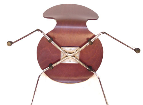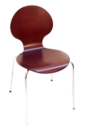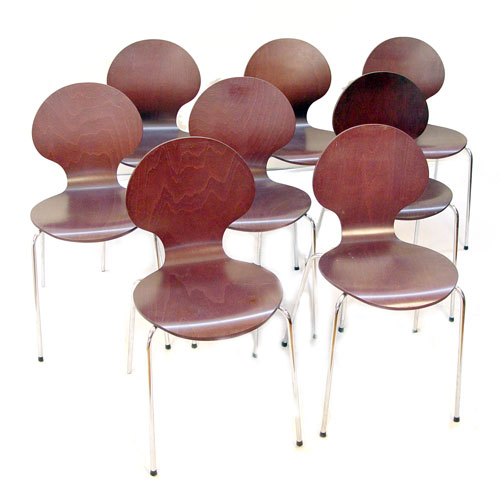 SET OF 8 MID CENTURY DESIGN STACKING CHAIRS: Very Arne Jacobsen looking. One piece molded wood seat and back, steel legs. 33''h. x 17'' x 16''.