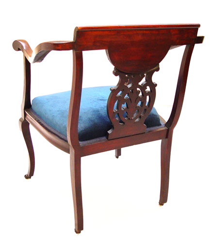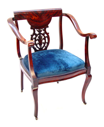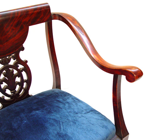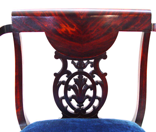 FLAME GRAIN MAHOGANY OPEN ARM CHAIR: 34''h. x 23'' x 20''.