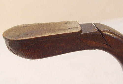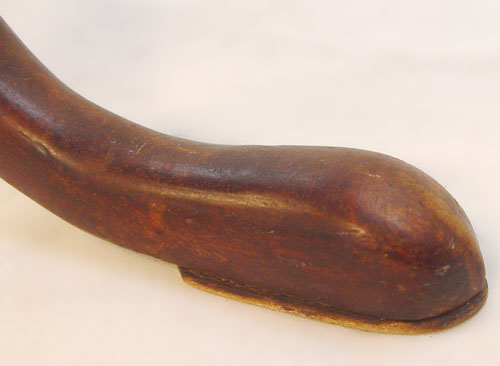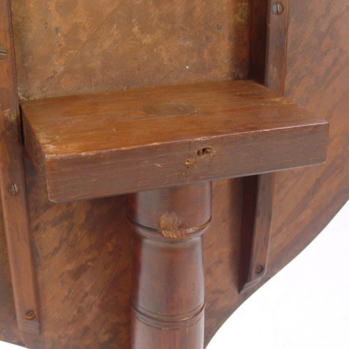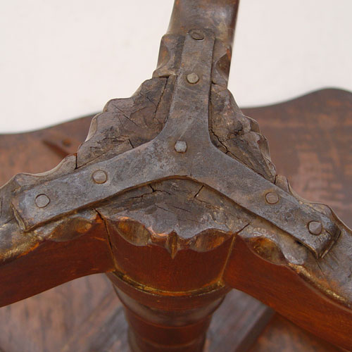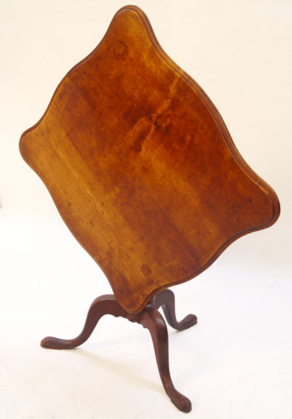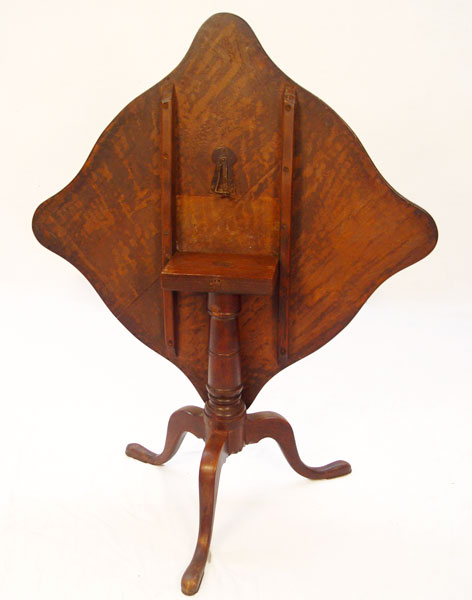 PERIOD TILT TOP TABLE: A shaped top constructed of two boards, tri pedestal base with iron supports on the underside. The top is 30 3/4''