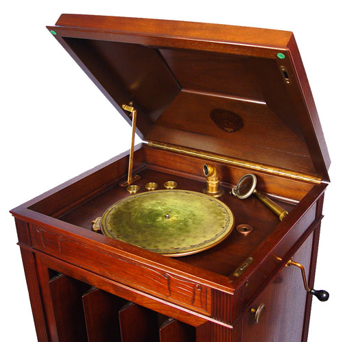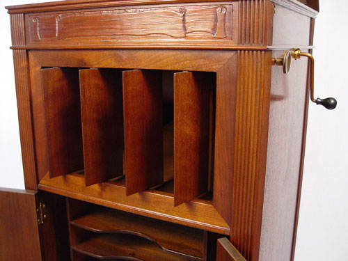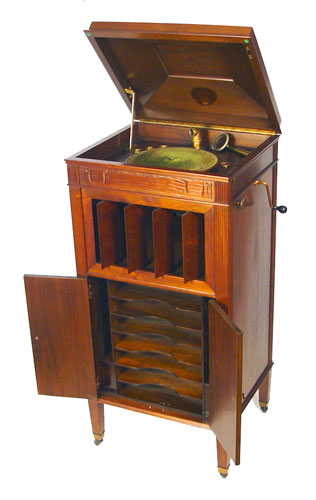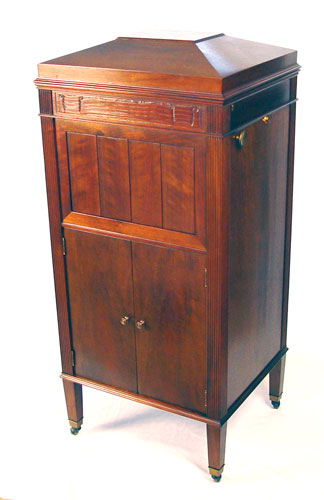 COLUMBIA FLOOR STANDING PHONOGRAPH: In fine mahogany case, cracks spins. 4 ft. tall. x 19'' x 21 1/2''.