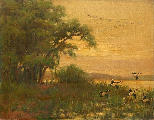 BERGSTROM, Charles J, (American, 20th C.): Landscape at Dusk with Ducks, O/CB, 10'' x 13'', signed, unframed. Needs cleaning.