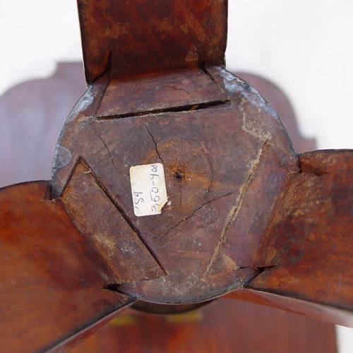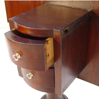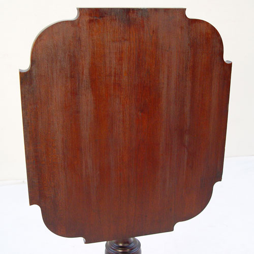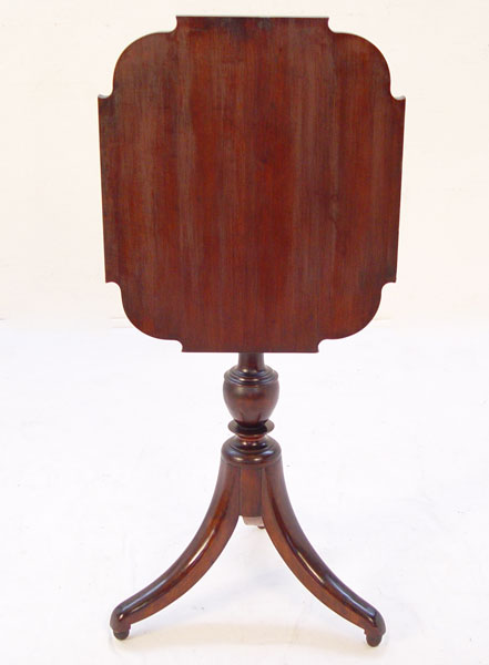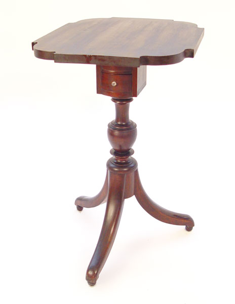 19TH C MAHOGANY TILT TOP TEA TABLE: Shaped top, 2 drawers in center pedestal, spider feet. Glass knobs on the drawers, 30'' x 21'' x 18''.
