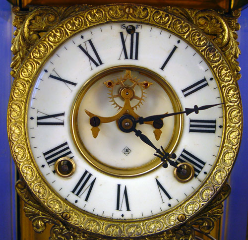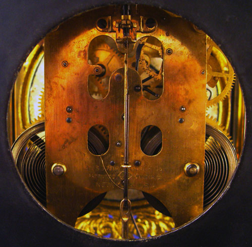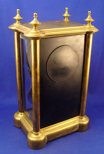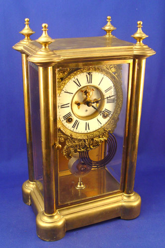 ANSONIA CRYSTAL REGULATOR CLOCK: Brass case with 2 sides and front door with beveled glass. Enamel dial, open escapement, masqueron pendulum. Key wind, time strike. 18''h. x 8 1/2' x 6 1/2''.