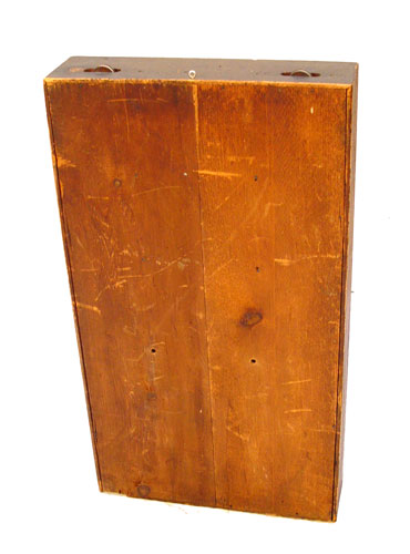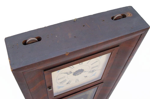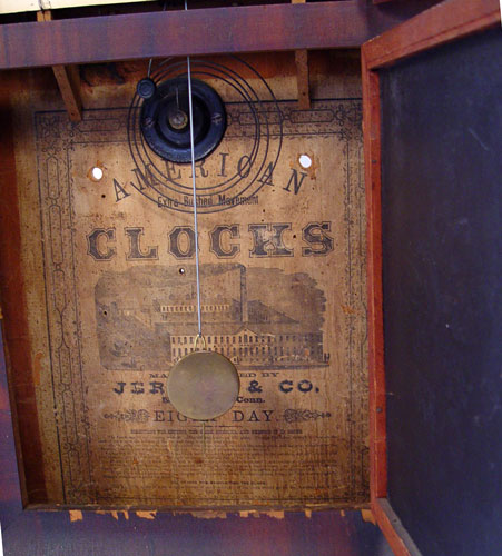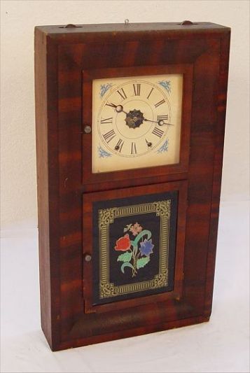 JEROME & CO. OGEE CLOCK: 19th C eight day wall clock. Paper label with instructions still intact. Pendulum included. 30'' x 16 3/4'' x 4 1/2'' deep. Please note some veneer loss.