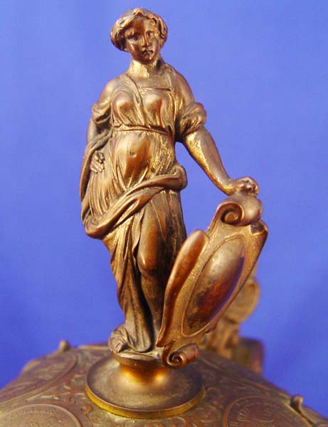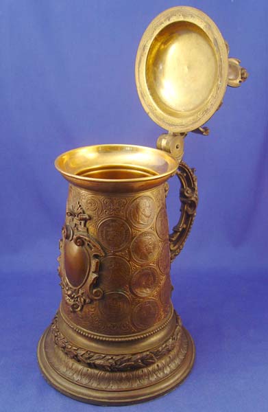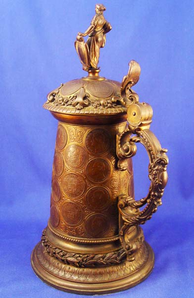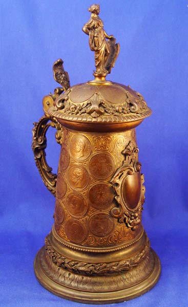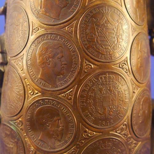 BRONZE COIN CLAD AUSTRIAN TANKARD STEIN: Figural hinged lid, the body and lid are covered in coins, copper lining. 14 1/2''h.