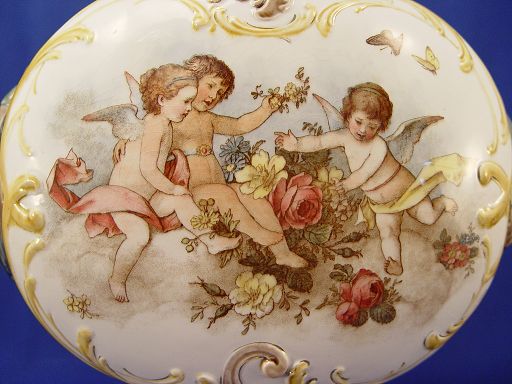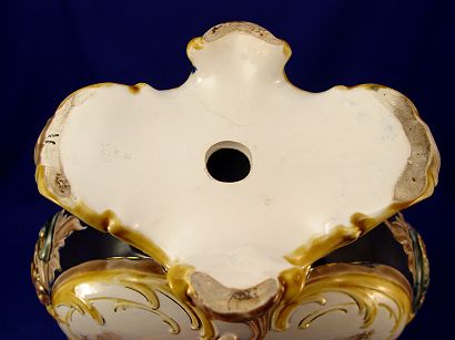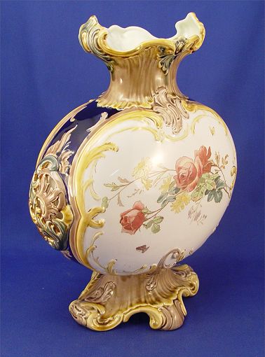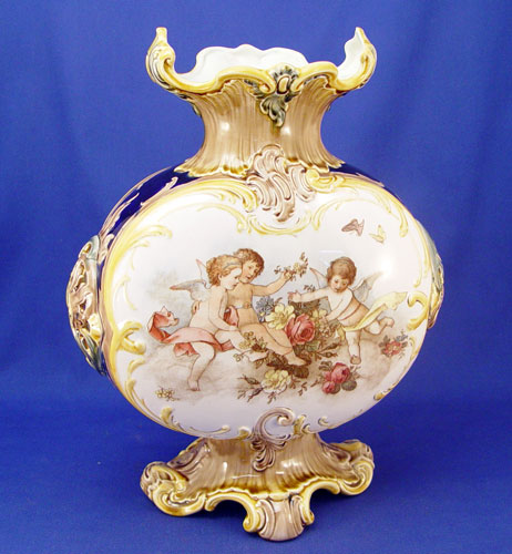 CUPID DECORATED GERMAN MAJOLICA PILLOW VASE: Cupids, roses, and butterflies decorate this 15'' tall vase, scrolled feet and beck. Reticulated side plaques. Drilled base.