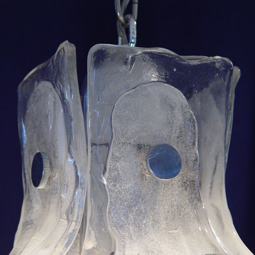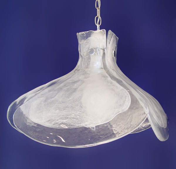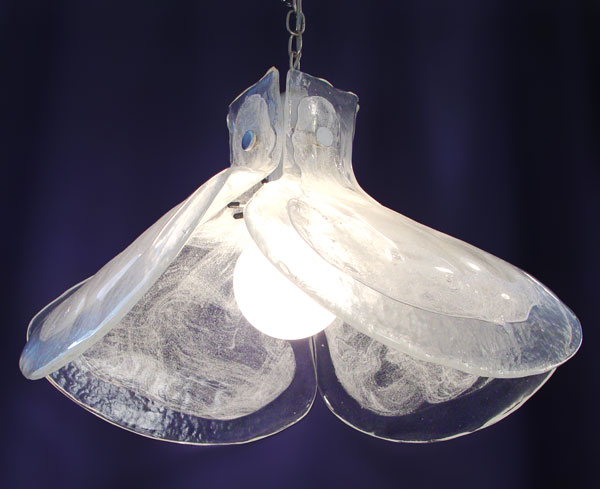 MODERNE MURANO BLOWN GLASS HANGING LAMP: Formed by four large petals of clear glass with white translucent centers.