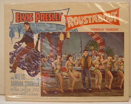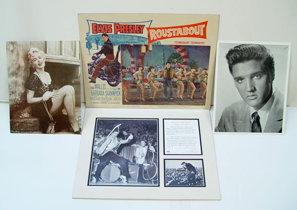 ELVIS MOVIE POSTER ROUSTABOUT PLUS PHOTO & COLLAGE: Posters are 14'' x 11''. Also includes one Marilyn Monroe photo card. Marilyn and Elvis photo are 11'' x 8''. Sold as a lot.