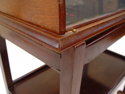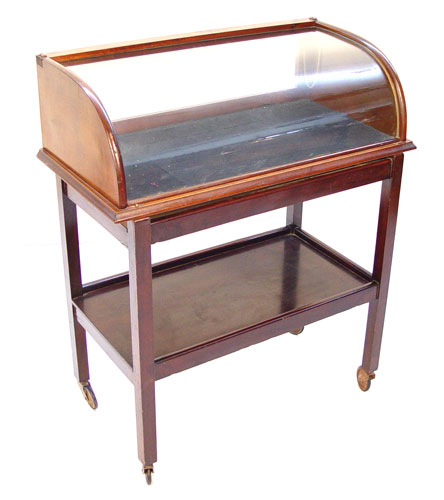 COUNTER TOP DOME FRONT MAHOGANY FRAME DISPLAY CASE: Mounted on teacart for ease of moving. Back opening, key included. 38''h. x 30 1/2'' x 16''. Case is 8 1/2''h.