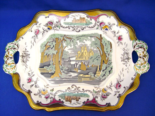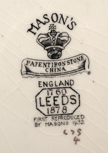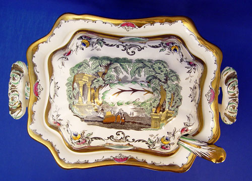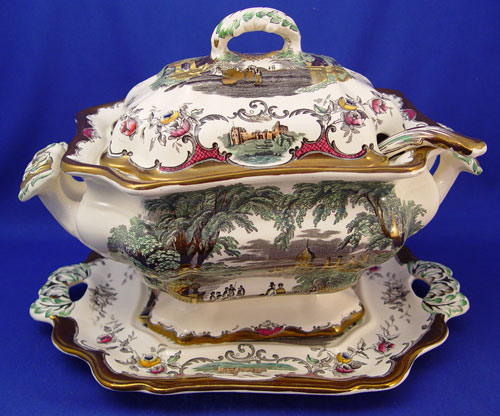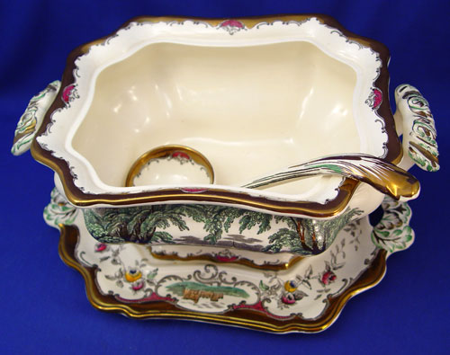 MASON'S COPPER LUSTER PATENT IRONSTONE TUREEN, UNDERPLATE, AND LADLE: The platter is 15'' x 10'', the ladle is 10 1/2'', the tureen is 9 1/2''h. x 14'' x 8''. Green and yellow transfer design.