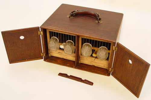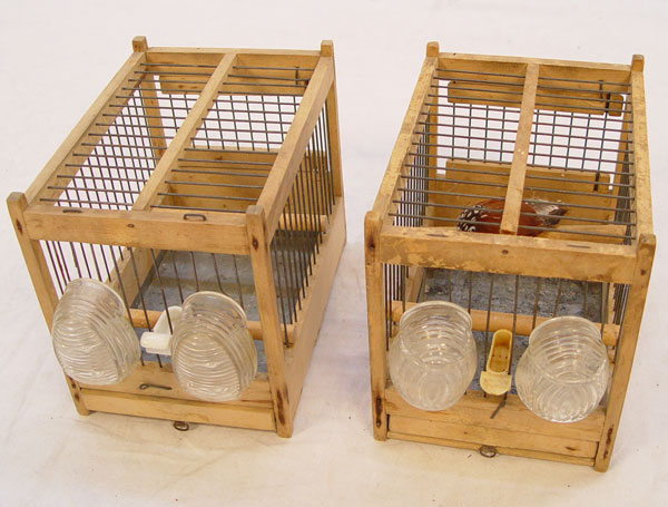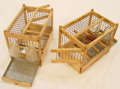 VICTORIAN TRAVELING BIRD CAGE: Wooden carrying case holds two cages, each with feed and water containers. Peep holes and bar lock. 8 1/4'' x 13 3/4'' x 11''.