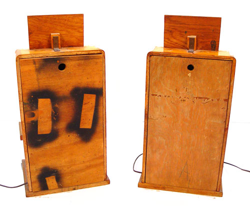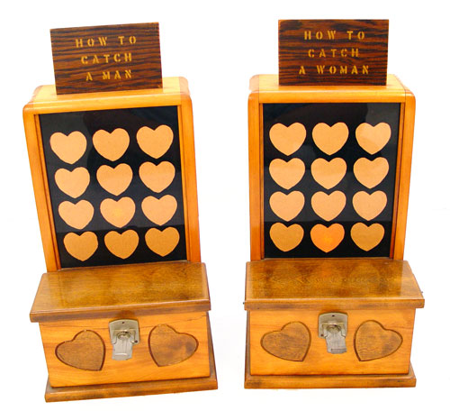 HAND CRAFTED FOLK ART COIN OPERATED NOVELTY MACHINES: ''How to Catch a Woman'' & ''How to Catch a Man'' advice. Wooden cases. 23'' x 11 1/4'' x 10''.