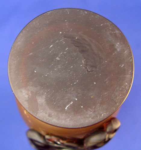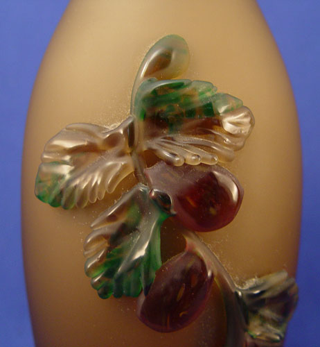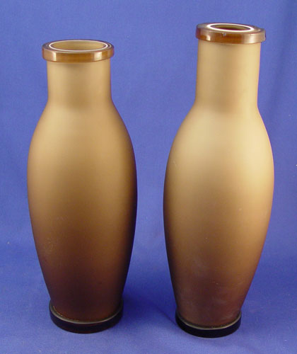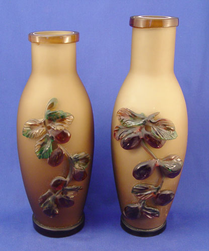 TWO LAYERED ART GLASS VASES: The extending rims are 3 color layers. Satin glass with applied berry decoration on the bottom, very heavy in weight. Please note the rim of one has a flaw in manufacture. One is 12''.5'', the other is 11 1/2''.