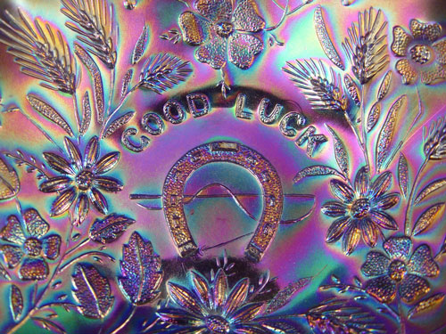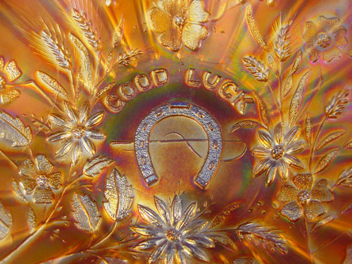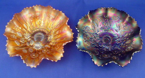 TWO NORTHWOOD ''GOOD LUCK'' CARNIVAL GLASS BOWLS: 1) Highly iridised dark blue, 8'' dia. 2 1/4''h. 2) Marigold, 8'' dia. 20 1/4''h.