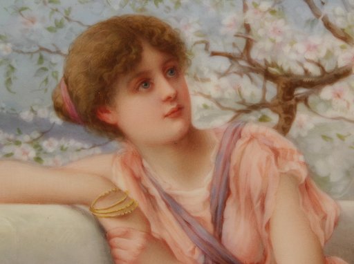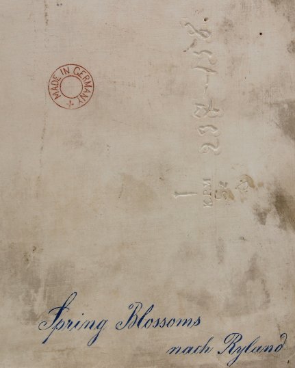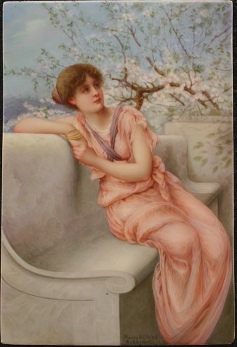 PERIOD KPM PORCELAIN PLACQUE AFTER RYLAND: ''Spring Blossoms'', after Henry Ryland, signed A. Schinzel?, 9 1/2'' x 6 1/4'', impressed KPM mark, circle ink Made In Germany mark. Est. $3000/5000**