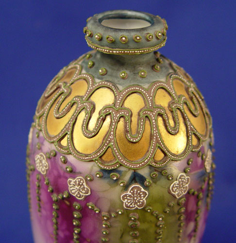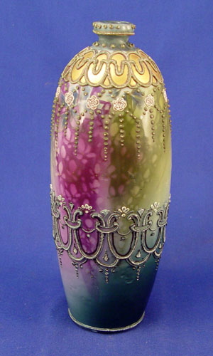 NIPPON VASE: Moriage and gold decoration on a ground of blended purples, blue and green. Maple leaf mark, 9''h. Free of chips or cracks, several beads lost just around the neck.