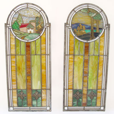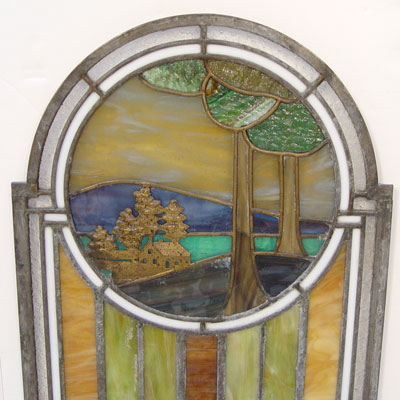TWO ARTS AND CRAFTS STAINED GLASS WINDOWS: Unusual rounded landscape design at the top of each incorporating embossed metal into the design. Each is different from the other. 31'' x 12''. Unframed.