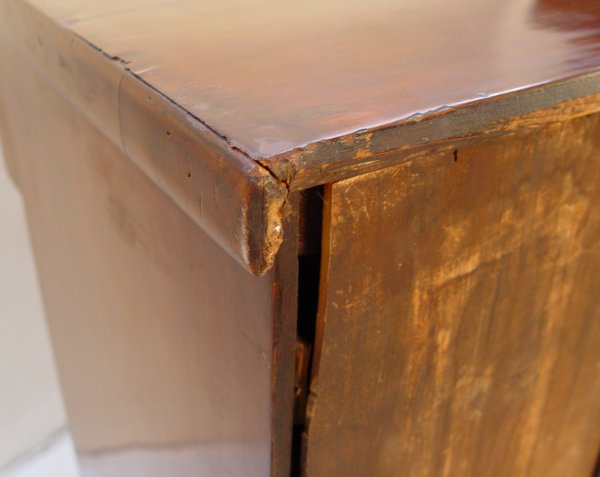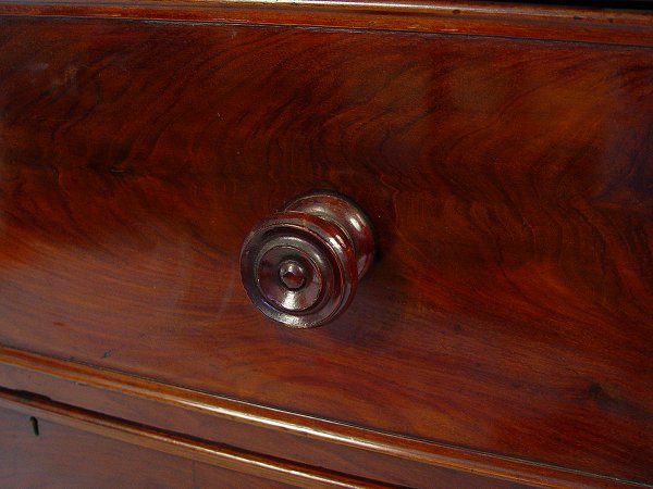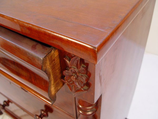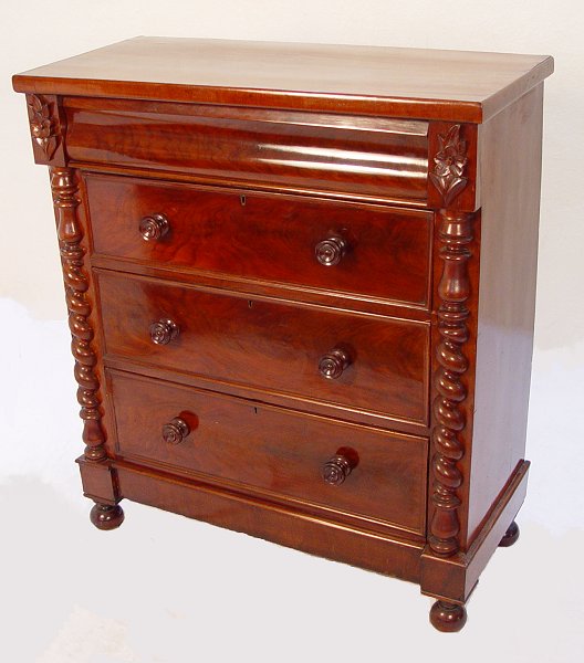 A MOST HANDSOME MAHOGANY SCOTTISH CHEST: Four drawer chest with ogee top drawer, spiral carved stiles, wood pulls, bun feet. 49 1/2''h x 43 1/4''w x 20 3/4''d.