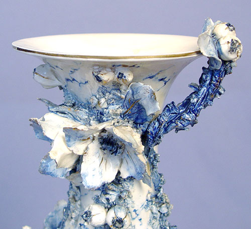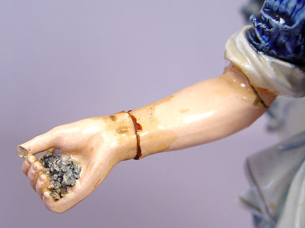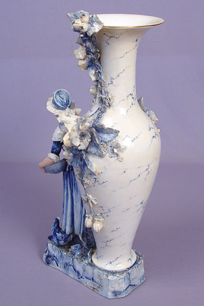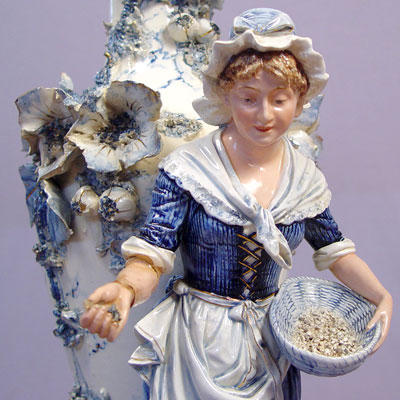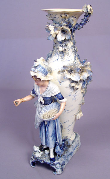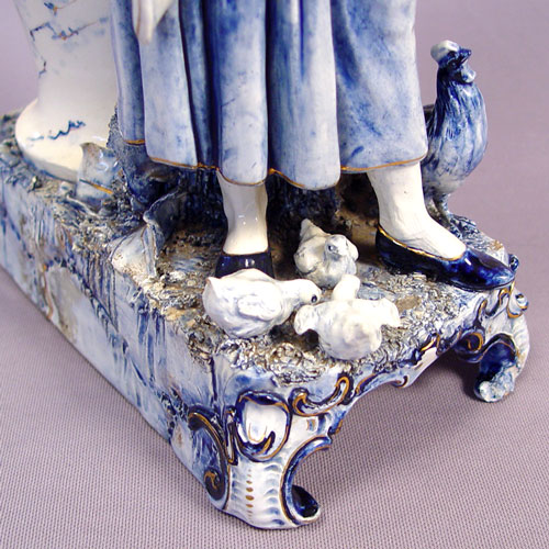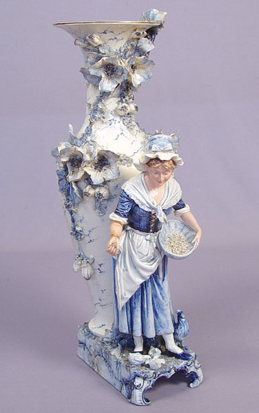19th C BLUE AND WHITE PORCELAIN VASE WITH MODEL OF A MAIDEN: Applied flowers on the vase, pre-mounted with a tall figure of a maiden feeding the hens. Please note restoration work and need. 22''h. x 9'' long at the base. No maker marks.