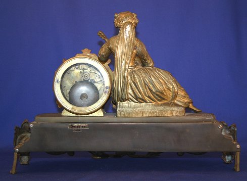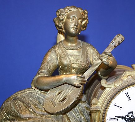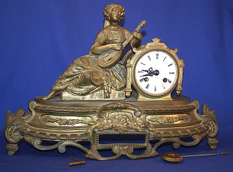 FRENCH FIGURAL CLOCK: Woman with sitar. The enamel dial does have wear around the key hole. Pendulum included. 11''h. x 16 1/2'', the dial is 3 1/2'' dia.