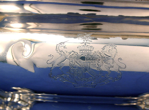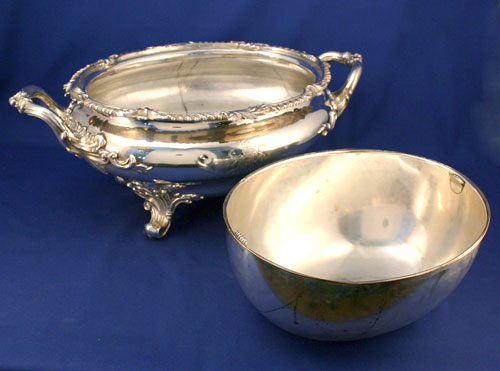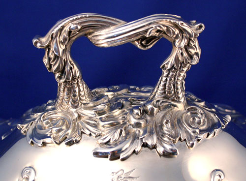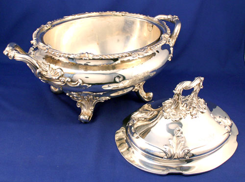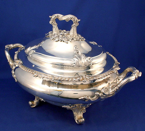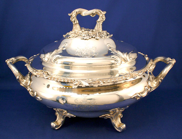 ELEGANT ENGLISH VICTORIAN SILVER TUREEN: London, 1855, maker Joseph Taylor. Scrolled feet, acanthus leaf decor, plated removable liner, clear hallmarks. 12''h, 18''l. Approx. 3240 grams or 104 oz. Weight does not include the insert.