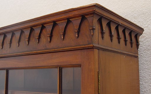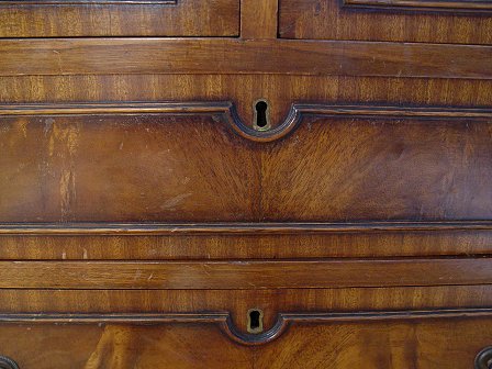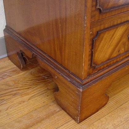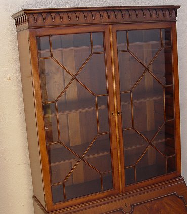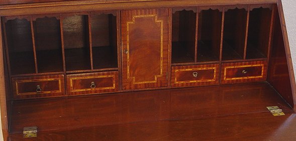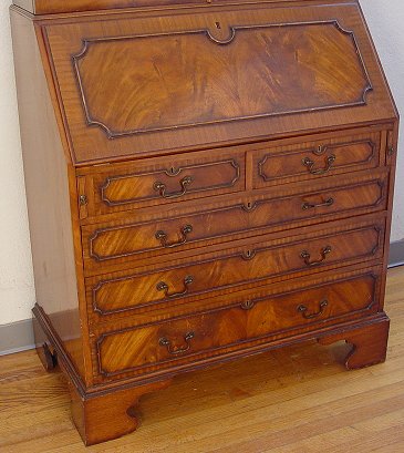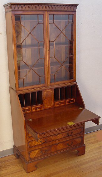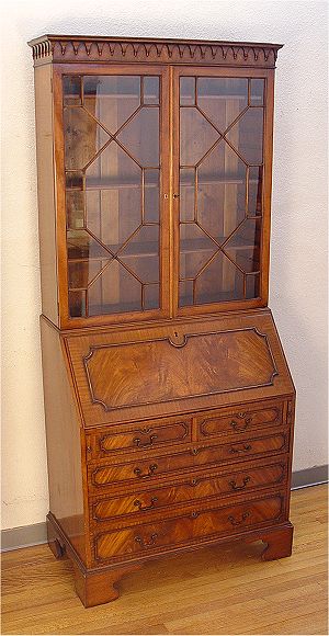 GEORGIAN MAHOGANY SECRETARY BOOK CASE: Late 19th century. Richly grained mahogany with upper section bookcase, lower section is a fall front desk, the interior fitted with cubicles and drawers. Shaped bracket feet. 84''h x 36'' x 21''
