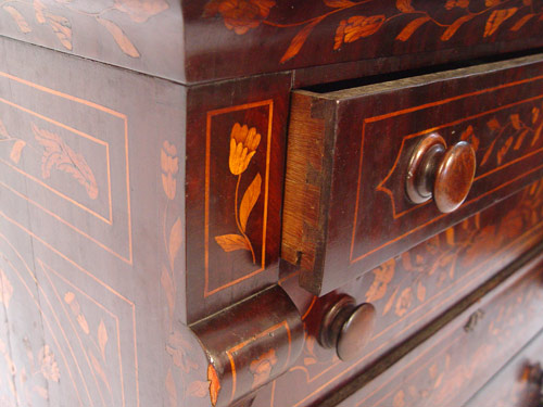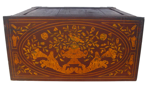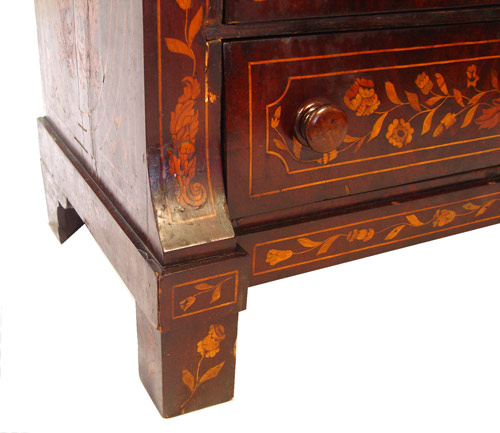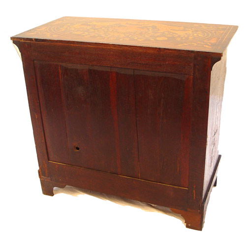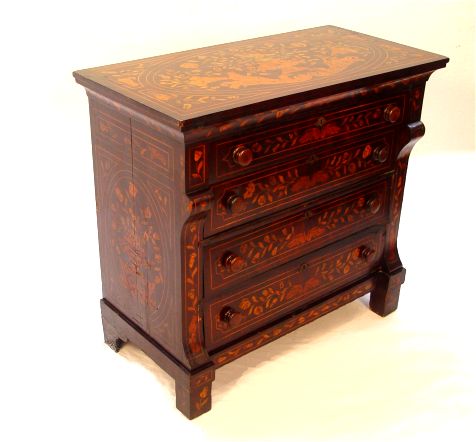 19th C DUTCH MARQUETRY INLAY CHEST: Four drawer chest, the top with inlaid nudes and urns. Wood knob pulls. Please call for condition. 38 1/2''h. x 41 3/4'' x 21''.