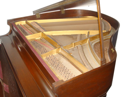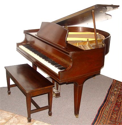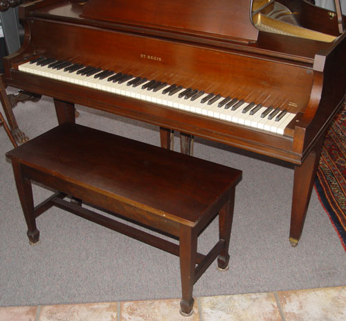 ST.REGIS MAHOGANY BABY GRAND PIANO: A product of Baldwin. Ivory keys, sound board is fine, Sold with the bench. The sound board is in good condition, with no cracks. 37 1/2''h. approx, 58'' long x 54'' wide.