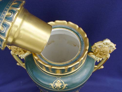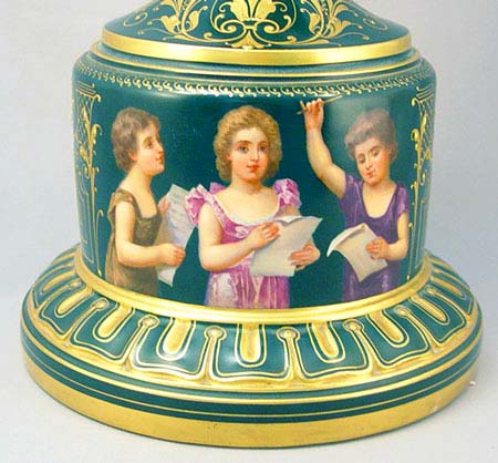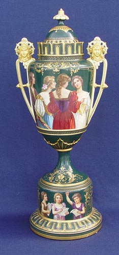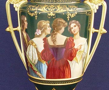 ROYAL VIENNA PORCELAIN PORTRAIT URN: Image of 4 ladies, artist signed RS, 22'' high overall. Blue beehive mark under glaze. Note the fine gilt detail and masqueron handles. Very slight chip to bottom interior of rim.