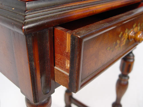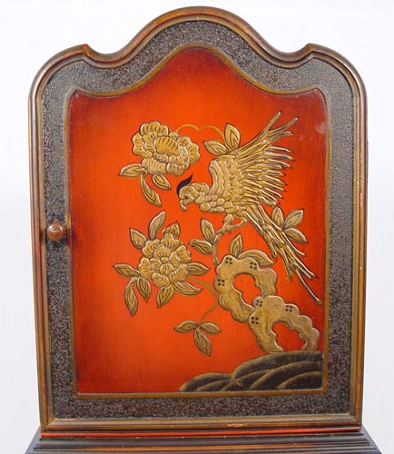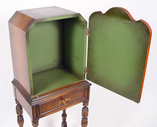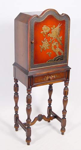 PETITE PAINT DECORATED CABINET: Circa 1930's telephone cabinet. 47 1/2'' high x 16 3/4'' wide x 12'' deep. Single drawer painted in flowers. Single door with puff Chinoiserie bird decor.