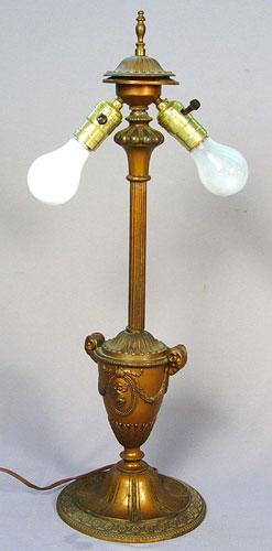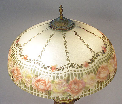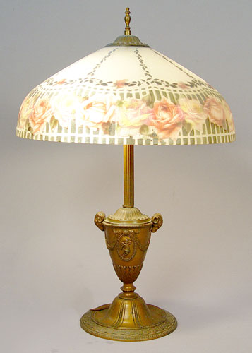 VINTAGE REVERSE ROSE DECORATED TABLE LAMP: Textured glass dome shade, rams head bronzed base. 24 '' tall, shade is 16'' dia.