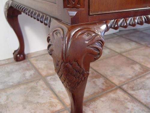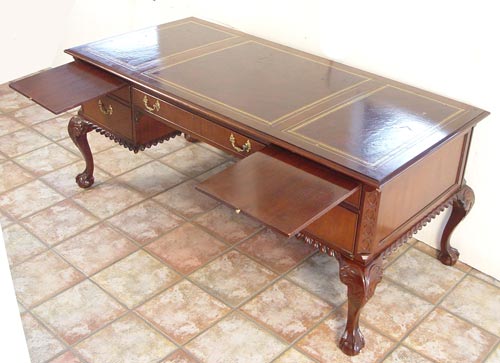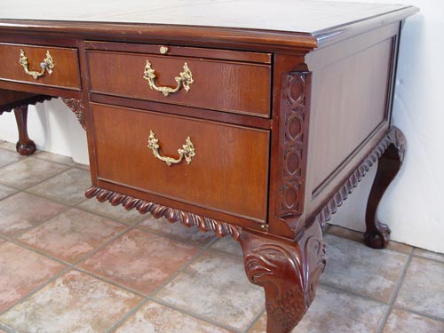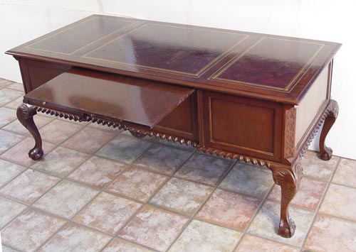 SUTTON MAHOGANY EXECUTIVE DESK: Carved ball and claw feet and gadroon edge. Leather top has wear. 31'' high x 71 1/4'' wide x 34'' deep.